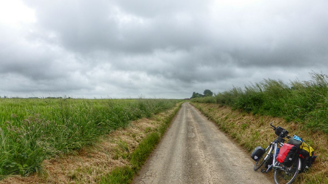 Het tempo zit er goed in en rond lunchtijd heb ik al 70 kilometer afgelegd. Als het dan ook nog begint te spetteren besluit ik een cafe op te zoeken om wat te eten. Ik heb wel brood mee, maar lust wel iets anders nu even, dat brood komt vanavond wel.