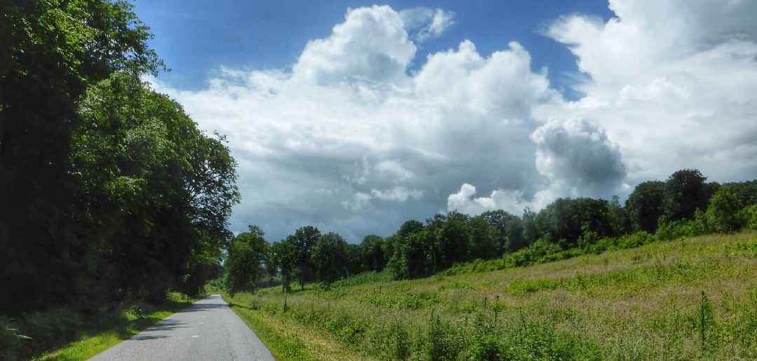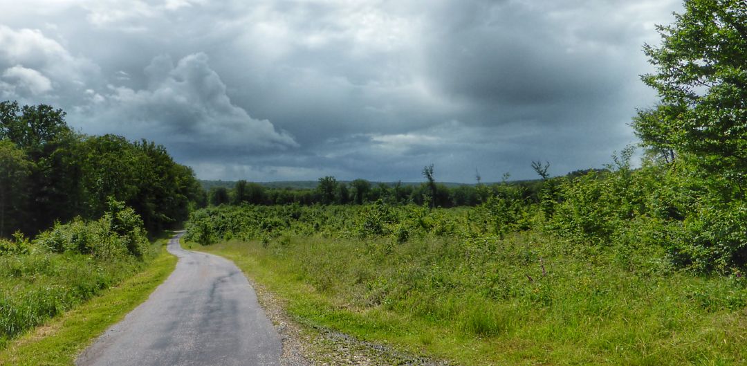 Uit het dal van de Seine moet je ook weer omhoog. Het is goed te doen, maar wel even werken. Dan een stukje langs een drukke weg, maar dan rechtsaf het bos in. En dat is een heel stuk. Eerst naar beneden en later nog een heel stuk omhoog. Ik kom niemand tegen voor vele kilometers, ergens bekruipen me angstige gevoelens, maar dat verdwijnt weer. De weg dampt af en toe van de zon die er op staat en die damp voel je ook..