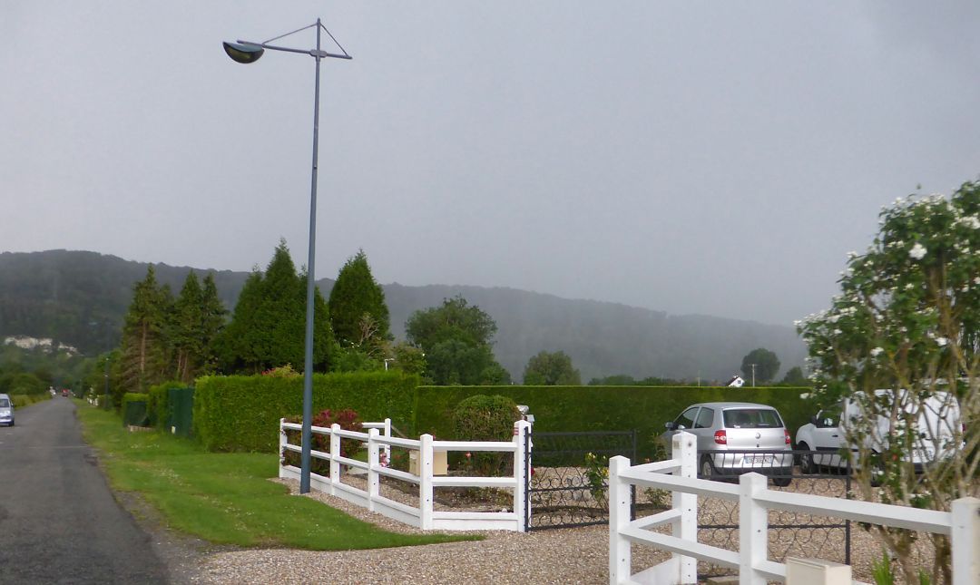 Ergens rond 1430 heb ik er al 60 kilometer opzitten en rij ik Jumiege binnen. In de verte zie ik dan al een flinke regenbui aankomen. Als ik stevig doortrap en de pont al bijna in zicht krijg, lijkt de overkant van de Seine te verdwijnen in de regen, en dat is niet heel ver weg.