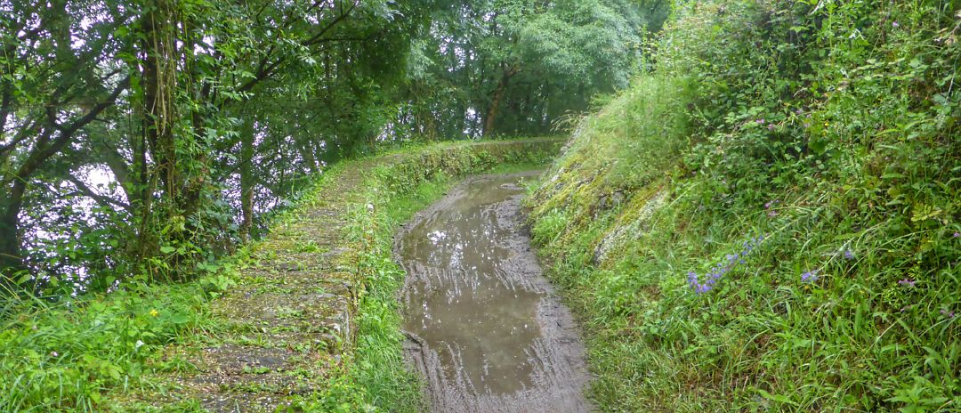 Het eerste stuk van de tocht is het een beetje blubberig hier en daar. Er is echt veel water gevallen en dat is te merken. Bij Oudon zet ik nog een mooie toren op de foto, maar daarna is het echt raak. Het pad is nat! Nouja, dan word ik dus ook maar een beetje vies, niks aan te doen.